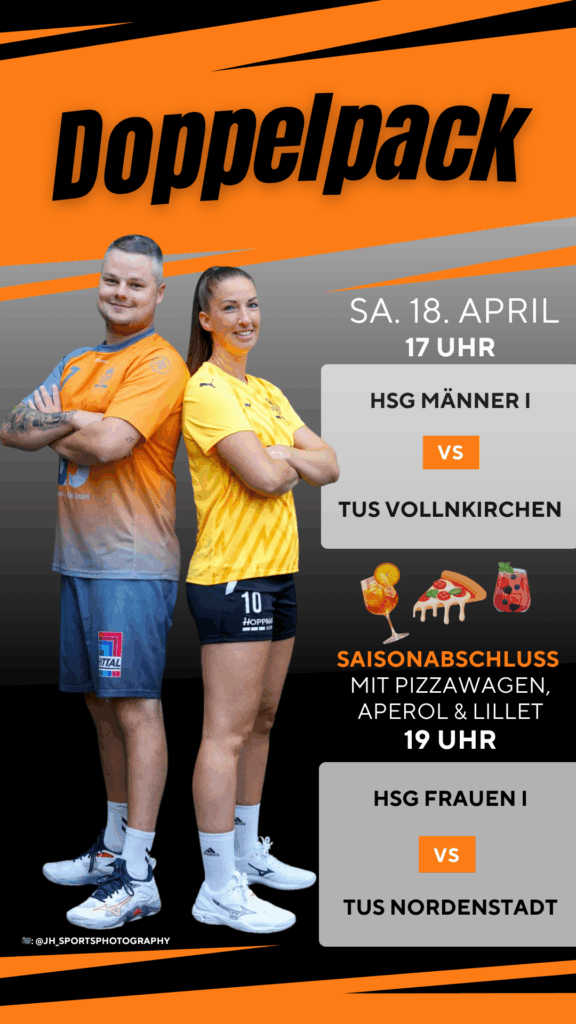 Heute findet der HSG-Saisonabschluss in der Holderberghalle statt. Los geht es um 17:00 Uhr mit den Männern. Das Spiel der Damen findet im Anschluss um 19:00 Uhr statt. Weiterhin auf dem Programm stehen u.a. die Eherungen der Jugendmannschaften. Außerdem gibt es Pizza vom Pizzawagen und ein erweitertes Getränkeangebot. Bitte seid lieber etwas früher in der Halle, da sich die Gastmannschaften mit Bussen angekündigt haben. Bis gleich!